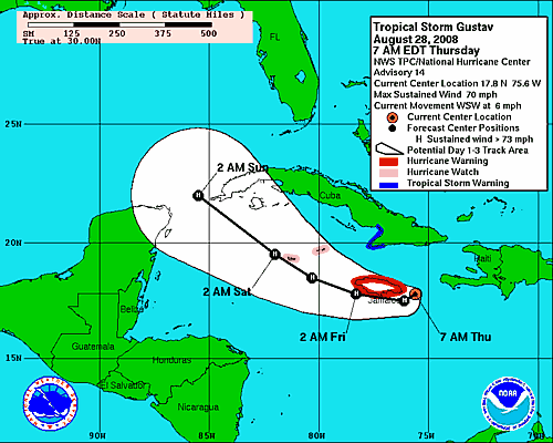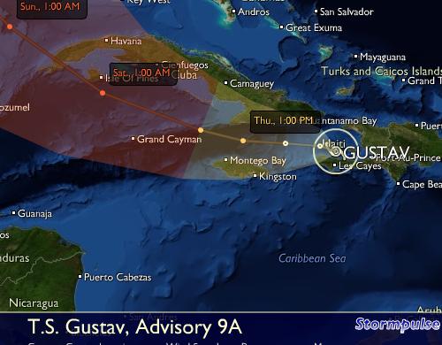 The bad: The storm is steering a more southern route now, aiming a lot closer to Grand Cayman. It was supposed to pass way north of Jamaica also. Now the Jamaicans will feel Gustav’s wrath and we may also get to see it much more close & personal.
