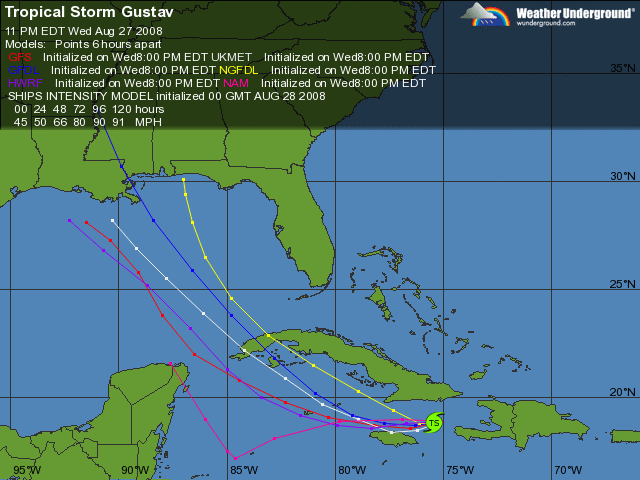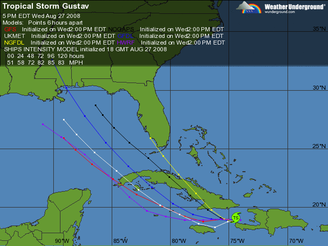This storm is painfully slow … lets get this over with already! It has barely left Haiti after spending all day there. The “spaghetti chart” is all over the place (see below) so no one really knows where this Gustav storm will really go! One of the forecasts have it directly on Grand Cayman (purple) , one has it on the sister islands (red), one on Jamaica (white) and some on Cuba (the others). Very reliable! 🙂