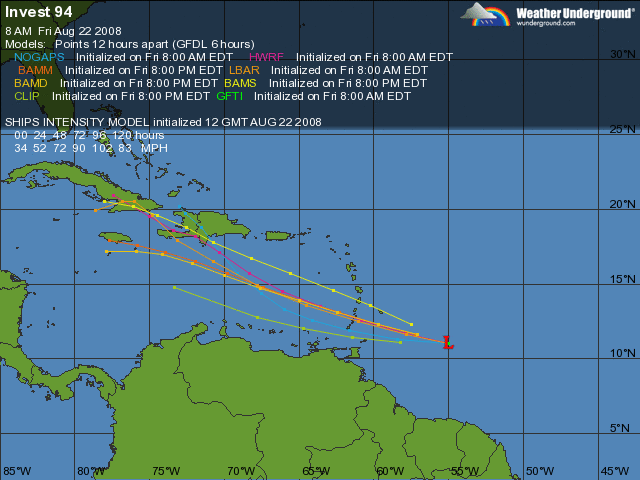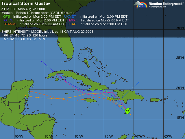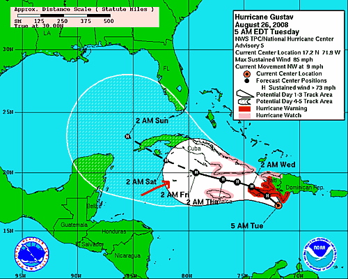 Gustav is now a Category 1 hurricane and it is expected to get to category 2 very soon. It will probably strike Haiti today. Unfortunately Gustav is turning west towards Jamaica. After Jamaica are the Cayman Islands … Current projections put the storm over 100 miles north of Grand Cayman. Its not all that bad, but not great either. For those not familiar with hurricanes, the “eye” of the storm (aka : the center) is the most dangerous part since that where the strongest winds are. So when a storm passes 100 miles away, it means that the eye is 100 miles away ; the further the better. At 100 miles away, the storm would probably only give us lots of rain and some minor damage such as knocked over trees, roofing damage to older homes, etc. Thats only the projection though ; where it will really end up is anyones guess.
