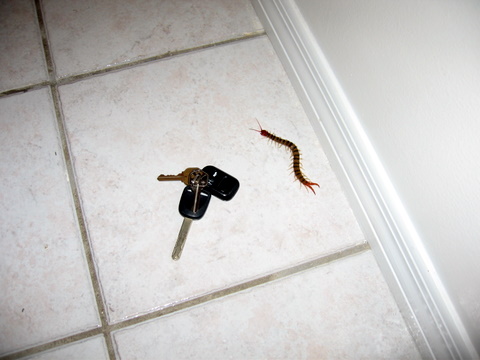 So I went to see and saw this … good lord!!!! I had heard about the tiger centipedes, but never seen one. So before exterminating this critter, I threw my car keys next to it for perspective and got the camera!