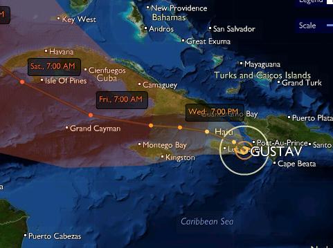 A work colleague showed me a new & pretty neat hurricane tracking site called StormPulse (www.stormpulse.com) A screen shot can be seen below with the path of Gustav passing above Grand Cayman ; hopefully.